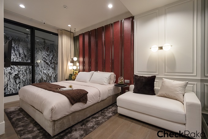 พื้นที่ห้องนอนขนาดใหญ่วางเตียงขนาด 6 ฟุตได้สบายๆ จัดวางโซฟาขนาดกระทัดไว้ข้างๆ เตียงก็ได้