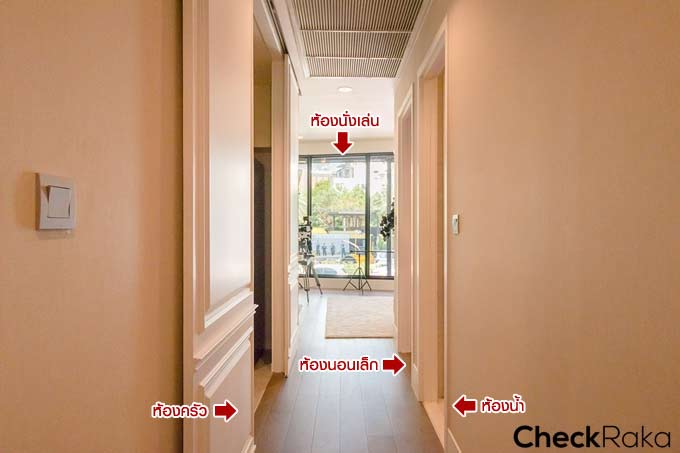 จากจุดนี้ทางซ้ายจะเห็นห้องครัว ทางขวาเป็นห้องน้ำที่ 2 และห้องนอนที่ 2 ส่วนตรงไปจะเป็นห้องนั่งเล่น