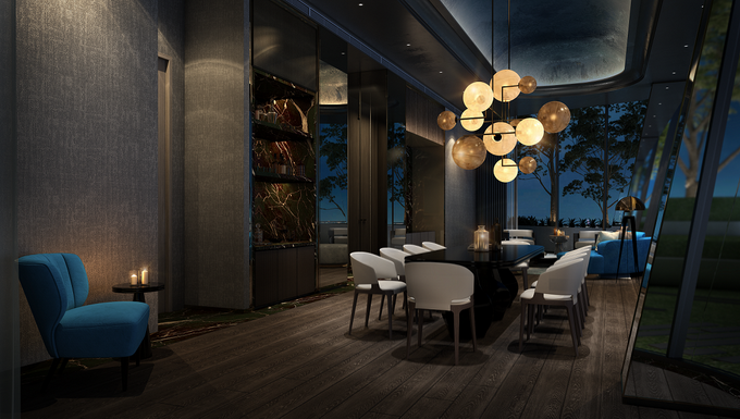 ตกแต่งด้วยผนังกระจกบานใหญ่รอบด้าน ขอบด้านข้างโค้งมนสามารถเทควิวได้แบบเต็มๆ ตา