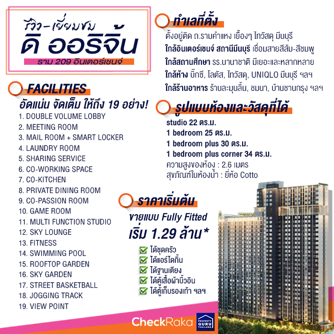เจ้าของและผู้พัฒนาโครงการ : บริษัท ออริจิ้น พร็อพเพอร์ตี้ จำกัด (มหาชน) ที่ตั้งโครงการ : ซอยรามคำแหง 209 ถนนรามคำแหง แขวงมีนบุรี เขตมีนบุรี กรุงเทพมหานคร 10510 อาคารชุดพักอาศัยสูง : 31 ชั้น จำนวน 1 อาคาร และอาคารจอดรถ 8 ชั้น 1 อาคาร จำนวนห้องพักอาศัย : 1,007 ยูนิต และ ร้านค้า 4 ยูนิต ขนาดที่ดินทั้งโครงการ : 4-0-87 ไร่ ลิฟต์ : ลิฟต์โดยสาร 4 ตัว และลิฟต์บริการ 1 ตัว ส่วนที่อาคารจอดรถลิฟต์โดยสาร 2 ตัว ห้องชุดพักอาศัย : มี 4 รูปแบบ ได้แก่ Studio 22 ตร.ม. 1 bedroom 25 ตร.ม. 1 bedroom plus 30 ตร.ม. 1 bedroom plus corner 34 ตร.ม. วันที่เข้าเยี่ยมชม - รีวิวคอนโด : 6 มิ.ย. 62 โครงการ