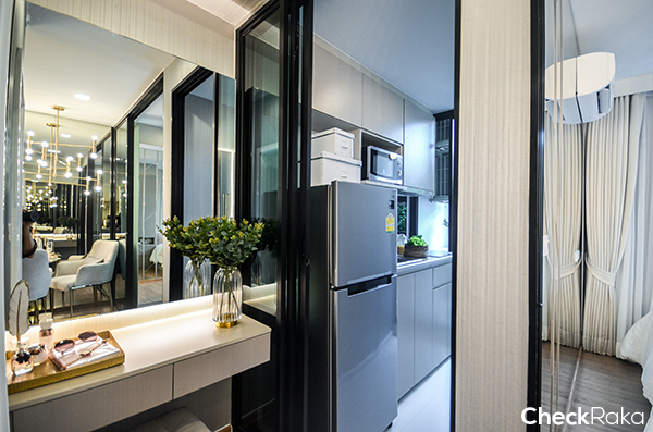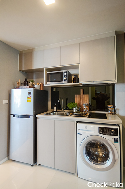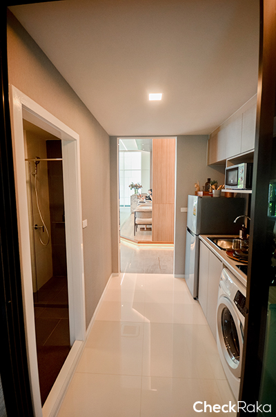 ออกมาจากห้องนอนแล้วมาดูมุมครัวกันค่ะ ครัวจะเป็นครัวเปิด ตั้งอยู่ตรงกลางระหว่างทางเข้าห้องน้ำและห้อง Plus