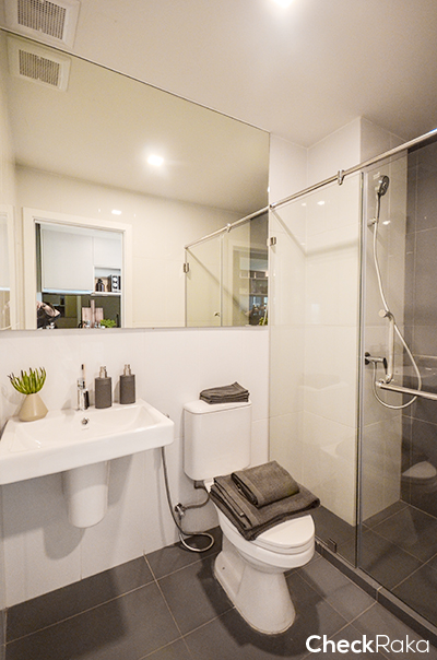ชั้นเก็บของด้านบนอาจจะได้น้อยกว่าห้องอื่นหน่อย แต่ก็ยังได้เตาไฟฟ้า เครื่องดูดควัน และอ่างล้างจานของ Teka ครบ ซ้ายมือเป็นห้องน้ำ พิเศษเฉพาะห้อง 1 Bed Plus จะได้ Smart Mirror กระจกที่ระบบสัมผัส