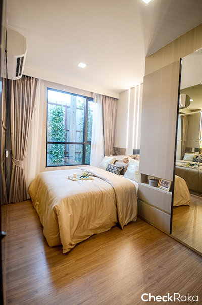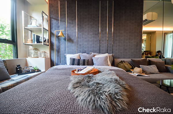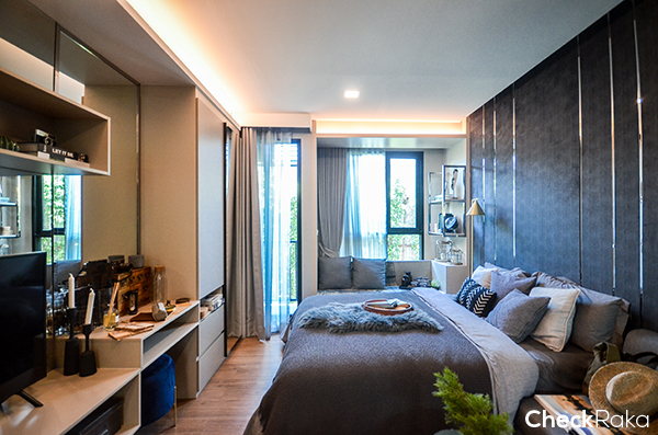 เป็นห้องขนาด 22 ตร.ม. ที่ดูกว้างมาก วางเตียงขนาด 5 ฟุตแล้วมีพื้นที่เหลือวางโซฟาได้ถึง 2 มุม