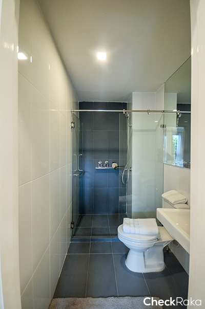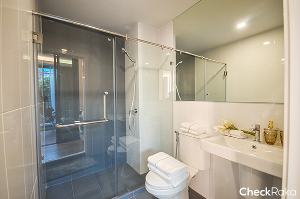 ตรงข้ามกับครัวจะเป็นห้องน้ำค่ะ ซึ่งสุขภัณฑ์เป็นของ Cotto ฝักบัว ก๊อกน้ำ เป็นของ VRH ฝักบัว ก๊อกน้ำ