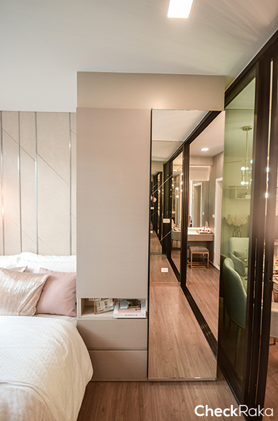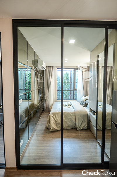 ห้องนอนจะกั้นด้วยประตูกระจกบานเลื่อน 3 ตอน มีฐานเตียงขนาด 5 ฟุตให้