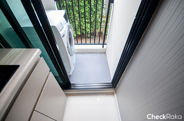 ระเบียงจะเป็นที่วางเครื่องซักผ้าค่ะ ต่อระบบไว้ให้เรียบร้อย