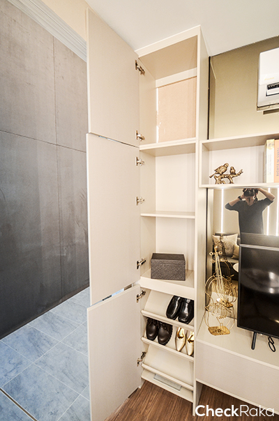 เฟอร์นิเจอร์ Built in ที่โครงการให้มาก็จะมีตัวชั้นวางทีวีและชั้นวางของด้านบน รวมถึงตู้เก็บรองเท้าสูงๆ ที่อยู่ชิดประตูด้วยค่ะ