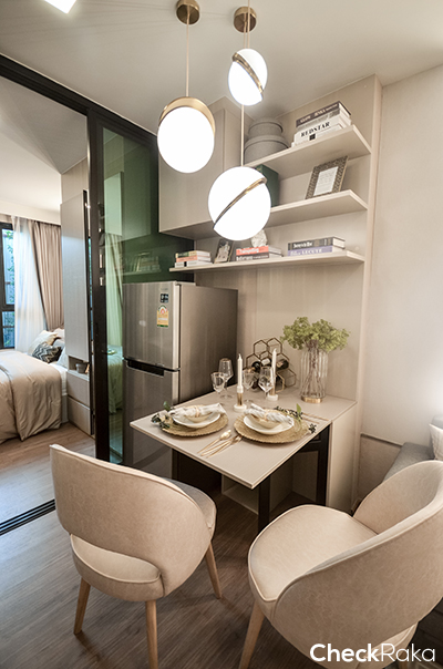 จุดนี้จะเป็นที่ตั้งโต๊ะรับประทานอาหารค่ะ โต๊ะและชั้นวางของ Built-in ด้านบนโครงการให้มาด้วยนะคะ โต๊ะสามารถพับเก็บได้ด้วย ข้างๆ เป็นที่วางตู้เย็นที่สะดวกต่อการเปิดใช้มากๆ