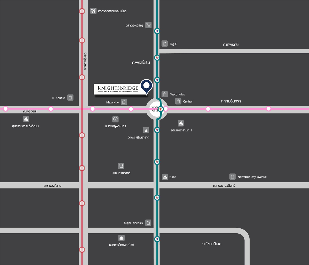 - ที่ตั้งโครงการ : ถนนพหลโยธิน (ตรงข้าม Tesco Lotus หลักสี่) แขวงอนุสาวรีย์ เขตบางเขน กรุงเทพฯ