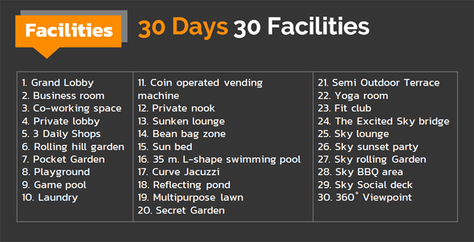 สิ่งอำนวยความสะดวกของโครงการนี้จัดว่าครบเครื่องกว่าใครในย่านนี้ ออกแบบได้หรูหราน่าใช้งาน และมีขนาดใหญ่บนเนื้อที่กว่า 3,700 ตร.ม. ที่มีให้เลือกมากถึง 30 รายการ ซึ่งถือว่ามากที่สุดเท่าที่ทางออริจิ้นเคยให้มา พูดได้ว่ามีพื้นที่ส่วนกลางสวยที่สุดในย่านนี้ จัดพื้นที่ส่วนกลางกระจายไว้ที่ชั้น Ground, ชั้น 4, ชั้น 5 และชั้น Rooftop ซึ่งข้อดีของการจัดวางสิ่งอำนวยความสะดวกกระจายตามชั้นแบบนี้คือ ช่วยลดความหนาแน่นเวลาที่ลูกบ้านมาใช้บริการพร้อมกัน และลูกบ้านยังได้ความเป็นส่วนตัวมากขึ้นอีกด้วย หากลูกบ้าน Tower A จะมาใช้บริการพื้นที่ส่วนกลางที่ Tower B ต้องลงลิฟต์ที่ชั้น 4 จะมีทางเชื่อมเพื่อเดินข้ามมายัง Tower B ได้ โดยแต่ละชั้นประกอบด้วย