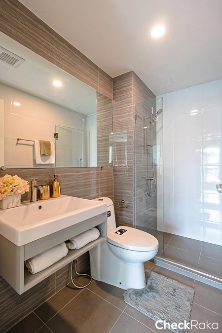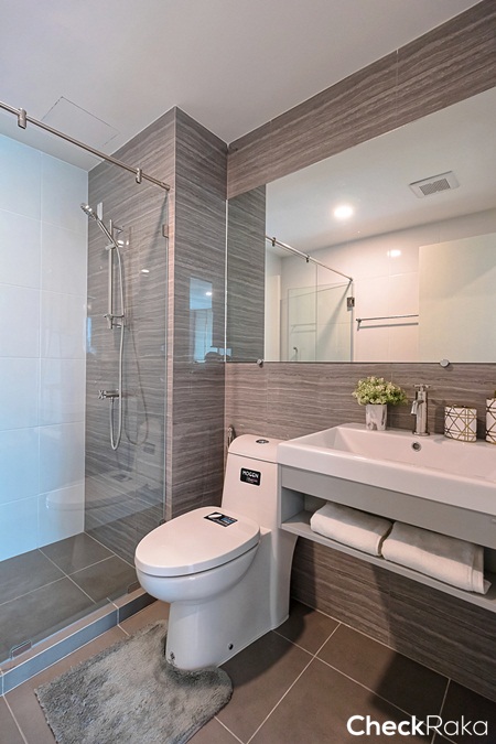 ภายในห้องน้ำแบ่งพื้นที่ใช้งานส่วนเปียกและส่วนแห้งแยกออกจากกันชัดเจน ติดกระจกเงาบานใหญ่มาให้ตามแบบนี้