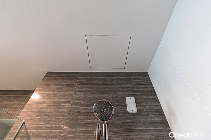 ติดตั้งไฟโคมไว้ที่ผนังฝั่งซ้าย 1 ดวง และติดตั้งก๊อกหัวแดงมาให้สำหรับซักล้างได้ที่มุมนี้