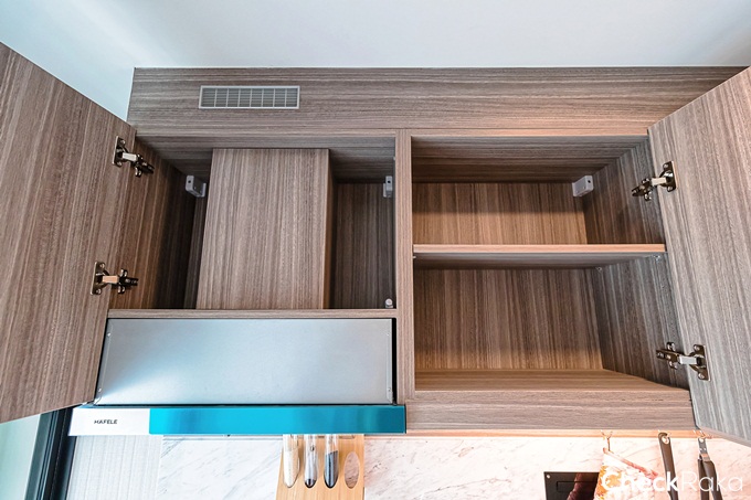 ได้ชุดครัว Built-in พร้อมช่องเก็บของด้านบนและด้านล่าง ได้ที่ราวแขวนครัวติดผนังมาให้แบบนี้ แต่ไม่ได้ Backsplash
