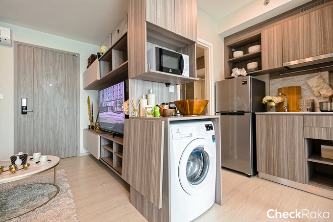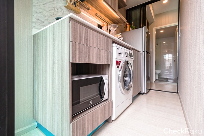 ตำแหน่งไมโครเวฟ และเครื่องซักผ้าวางไว้ใต้เคาน์เตอร์ครัว วางเครื่องซักผ้าแบบฝาหน้าขนาด 8 กิโลกรัม