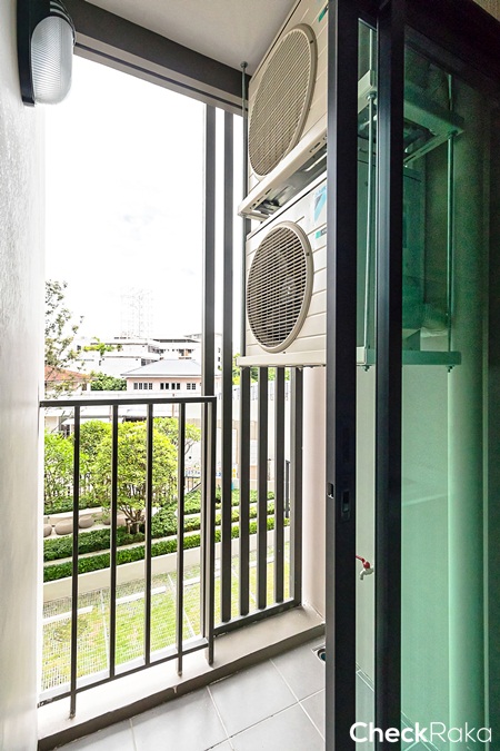 คอมเพรสเซอร์ยกลอยไว้ที่ผนังฝั่งขวาของระเบียง ทำให้สามารถใช้พื้นที่ตรงระเบียงได้อย่างเต็มพื้นที่