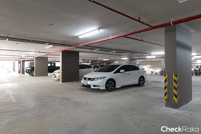 ที่จอดรถจัดแบ่งช่องจอดชัดเจน มีเสากันชนสำหรับหยุดรถมาให้ บนเพดานติดไฟส่องสว่างมาให้เยอะพอสมควร