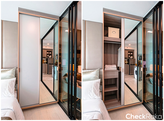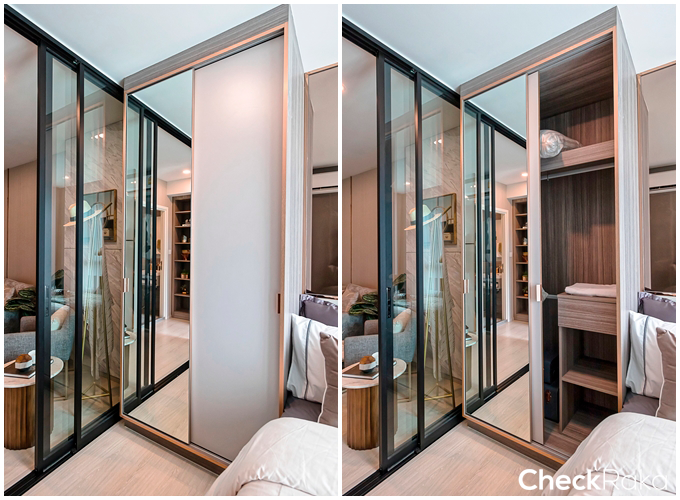 และอีกฝั่งเป็นกระจกเงาบานใหญ่ หน้าบานสามารถเลื่อนสลับซ้ายขวาได้ ออกแบบที่จับให้เปิดได้ถนัดมือ