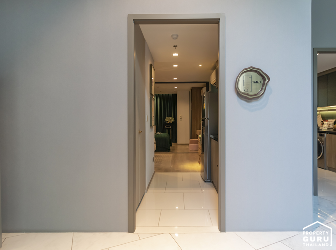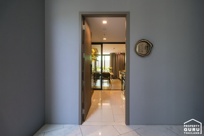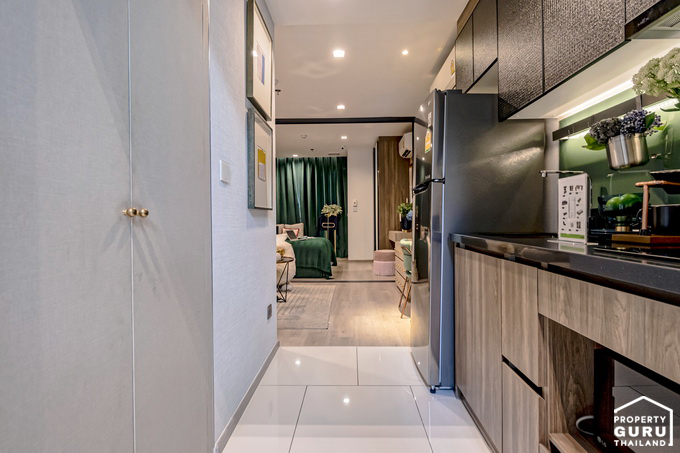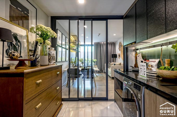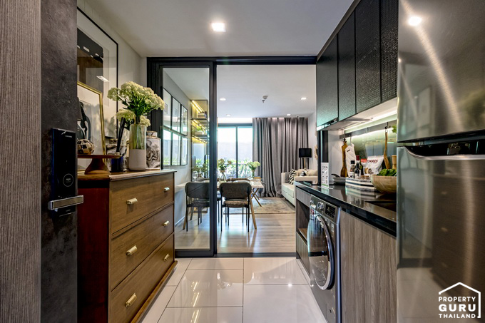 เปิดประตูเข้ามาส่วนแรกจะเป็นพื้นที่ครัวแบบปิด มีประตูบานสไลด์กั้นให้ระหว่างโซน Living