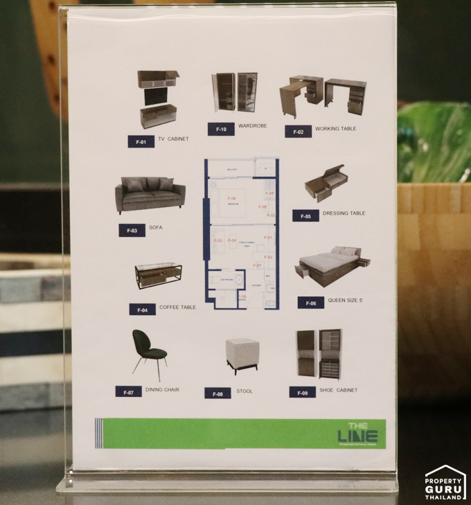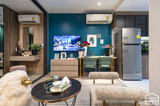 | 1BR | 1. TV 40" 2. ไมโครเวฟ 23 ลิตร 3. ตู้เย็น 9 คิว 4. Water Heater 6,000 w | 1. Furniture Package 2. Home Automation 3. Voice Command |