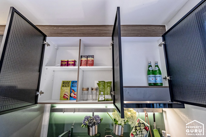 ทางโครงการให้ชุดครัวจะเป็นเคาน์เตอร์ รวมถึงชั้นวางของด้านบน หน้าตาและสีแบบนี้