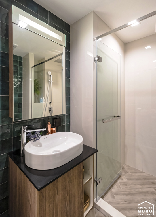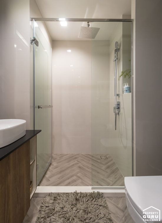 แยกส่วนเปียก/แห้งอย่างชัดเจนด้วยประตูกระจก Temper และมีฝักบัวแบบ Rain Shower