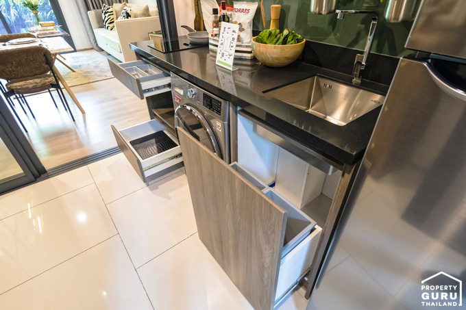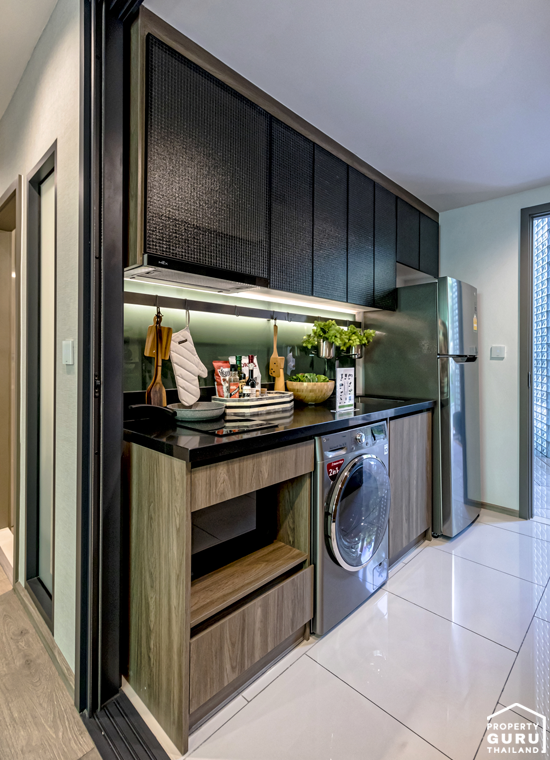 เคาน์เตอร์ครัว พร้อมช่องเก็บของ และพื้นที่วางเครื่องซักผ้า