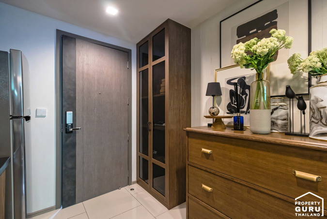 ฝั่งตรงข้ามเคาน์เตอร์ครัว จะให้โต๊ะวางของและตู้รองเท้าตามลิส Furniture Package