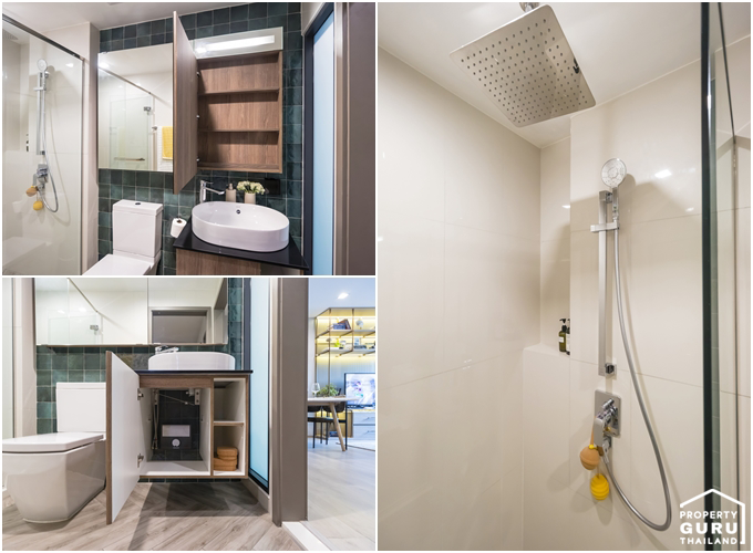 มีตู้เก็บของบานปิดให้ทั้งบนและล่าง แต่ตัวกระจกไม่ใช่บานใหญ่แบบนี้นะคะ ส่วนฝักบัวเป็นแบบ Rain Shower ค่ะ