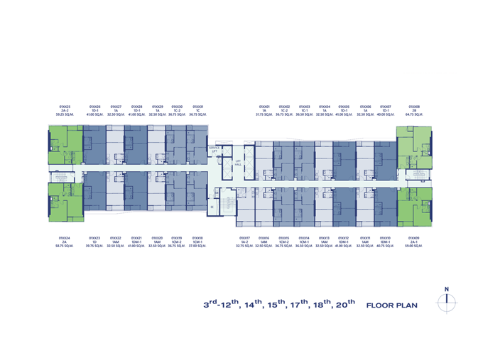 Floor Plan ชั้น 3-12, 14, 15, 17, 18, 20 แต่ละชั้นจะมีจำนวนห้องชั้นละ 31 ห้อง