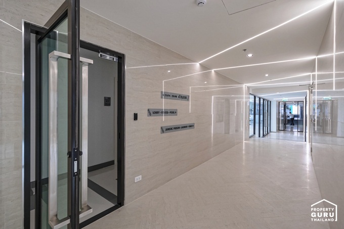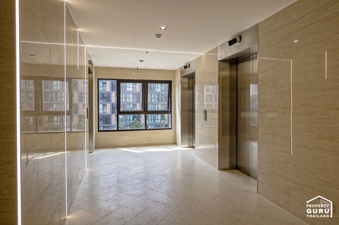 โถงลิฟต์บนชั้นพักอาศัยตกแต่งด้วยผนังลายหินอ่อน