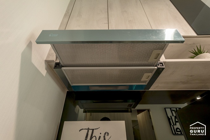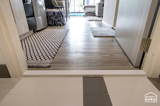 มองย้อนกลับไปที่ประตูทางเข้าห้อง จะเห็นว่าโซนห้องครัวเพดานลดระดับลงมาประมาร 10 ซม.