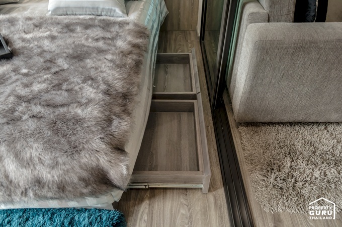 ได้ตู้เก็บของทั้งข้างบนและข้างล่าง เป็นตู้บานเปิด หน้าบานเป็นกระจก และอีกด้านปิดผิวลายไม้