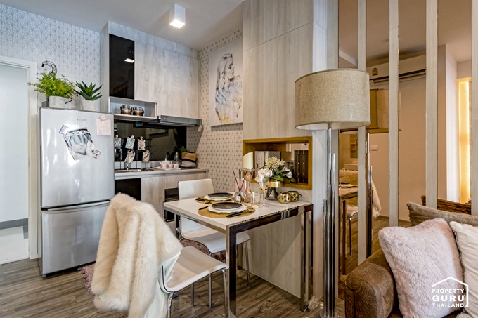 มุมนี้จึงสามารถวางโต๊ะทานอาหารขนาด 4 ที่นั่งได้ โดยการที่ห้องครัวอยู่ใกล้โต๊ะทานอาหาร ข้อดีคือสามารถปรับเป็นพื้นที่เตรียมอาหารได้