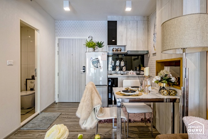 ฝั่งตรงข้ามเคาน์เตอร์ครัว เป็นพื้นที่สำหรับวางโต๊ะทานอาหาร แต่ห้องจริงผนังจะเรียบเสมอกันไม่ยื่นออกมาแบบนี้