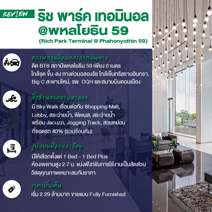ริชพาร์ค เทอมินอล @พหลโยธิน 59 (Rich Park Terminal @ Phahonyothin 59) คอนโดเพดานสูง สไตล์ Loft ติดรถไฟฟ้าสายสีเขียว ส่วนต่อขยาย สถานีพหลโยธิน 59 เพียง 0 เมตร มี Sky Walk เชื่อมต่อจากรถไฟฟ้าเข้าสู่ Shopping Mall ภายในโครงการ พร้อมชมสิ่งอำนวยความสะดวก ไปดูกันสิว่าสร้างเสร็จแล้วจะมีความสวยงามขนาดไหน ตามไปชมกันเลยค่ะ