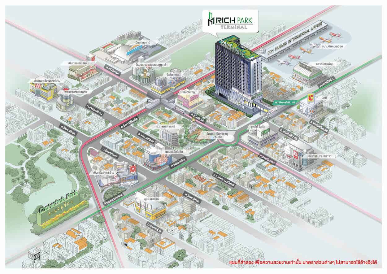 รูปแผนที่โครงการ ริชพาร์ค เทอมินอล @พหลโยธิน59 (คลิกเพื่อดูภาพขนาดใหญ่) ในส่วนของการเดินทางด้วยรถยนต์ส่วนตัวสามารถเดินทางเข้า-ออกโครงการได้หลายเส้นทาง ทั้งถนนพหลโยธิน ถนนรามอินทรา ถนนเทพรักษ์ และถนนแจ้งวัฒนะ หรือจะเลือกใช้ ทางพิเศษศรีรัช และทางยกระดับอุตราภิมุข (ดอนเมืองโทลล์เวย์) ก็สะดวกเช่นกัน