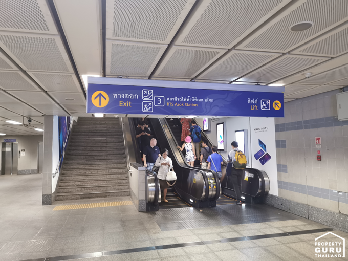 จาก Metro Mall เลี้ยวซ้ายมาจะเห็นบันไดเลื่อนซึ่งเป็นทางเชื่อมไปขึ้นรถไฟฟ้า BTS สถานีอโศก