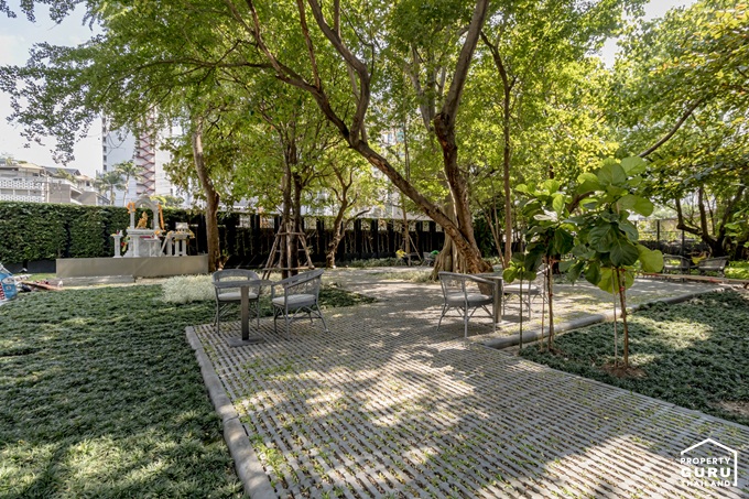 ด้านหน้าโครงการตกแต่งเป็นสวนขนาดใหญ่ให้ความร่มรื่น มีต้นไม้ใหญ่ที่ช่วยให้ร่มเงา