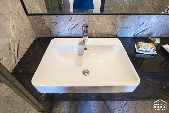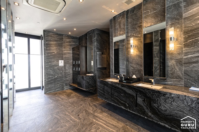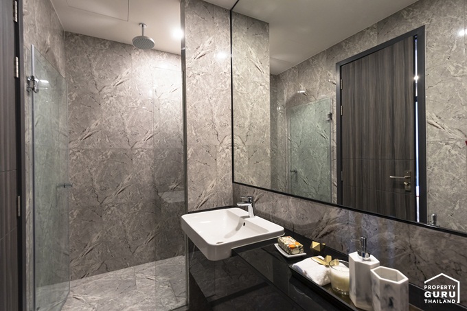 พื้นและผนังปูด้วยกระเบื้องแกรนิตโต้แผ่นใหญ่ลายหินอ่อน ได้กระจกเงาบานใหญ่
