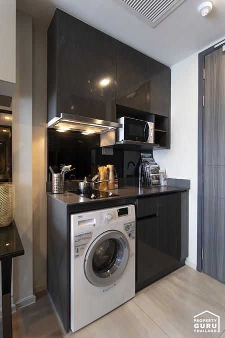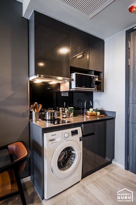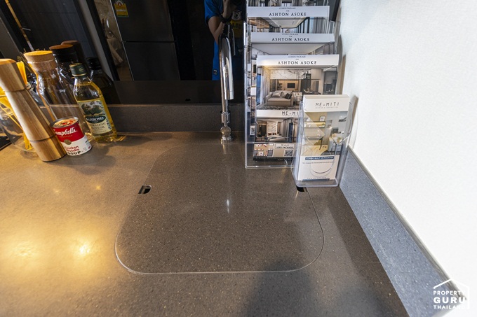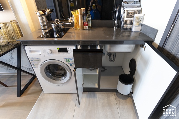 ด้านล่างติดตั้งถังขยะมาให้ด้วย 1 ใบ มีลิ้นชักสำหรับเก็บช้อนส้อม ตู้เก็บของ และช่องสำหรับวางเครื่องซักผ้า