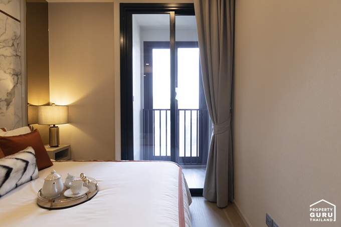 ห้อง Type นี้จะได้กระจกโค้งเปิดมุมมองให้เทควิวได้กว้างมากขึ้น จัดวางเป็นโซฟาเบดสำหรับนั่งเล่นตรงจุดนี้ได้