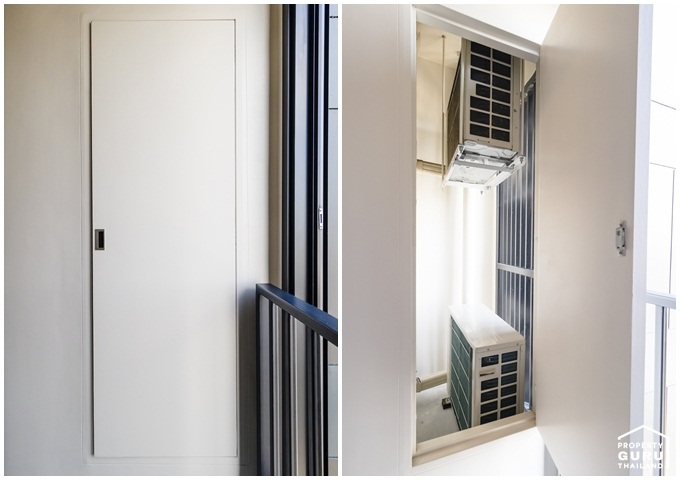 เก็บคอมเพรสเซอร์แอร์ไว้ด้านข้างของระเบียง มีประตูปิดมิดชิดเป็นสัดส่วน