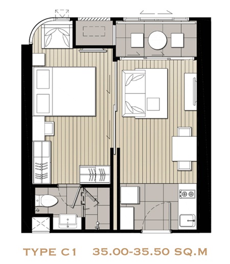 2) ห้องแบบ 1 ห้องนอน พื้นที่ใช้สอยขนาด 35 ตร.ม.