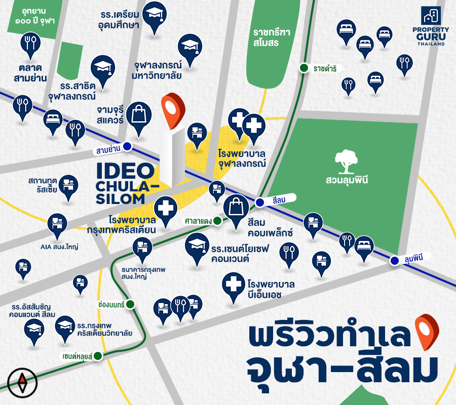 เชื่อว่า หลายคนรู้จักทำเลนี้กันดี ด้วยชื่อเสียงเรียงนามของทำเล "จุฬา-สีลม" ที่เชื่อมต่อกันระหว่างศูนย์รวมการค้า ศูนย์รวมสถานศึกษาชั้นนำของประเทศ และศูนย์รวมโรงพยาบาลชั้นนำอย่าง "สยาม-จุฬา" กับทำเล CBD ฮอตไม่เคยตกอย่าง "สีลม" ย่านที่เต็มไปด้วยอาคารสำนักงาน โรงแรมชั้นนำ ศูนย์การค้า และทั้ง 2 ทำเลก็เชื่อมต่อกันง่ายด้วยรถไฟฟ้าสายหลัก 2 สาย คือ BTS สายสีเขียว และ MRT สายสีน้ำเงิน วัดระยะเดินโดยประมาณโครงการนี้ใกล้ BTS สถานีศาลาแดง ประมาณ 400 เมตร และ ใกล้ MRT สถานีสามย่าน ประมาณ 300 เมตร