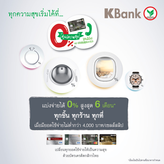 ในตลาดบัตรเครดิตตอนนี้ โปรโมชั่นที่น่าสนใจคือ "โปรโมชั่นแบ่งจ่ายได้ 0% สูงสุด 6 เดือน ทุกชิ้น ทุกร้าน และทุกที่" จากบัตรเครดิตธนาคารกสิกรไทยค่ะ ซึ่งสามารถใช้ได้กับทุกร้านค้าเลย ไม่ว่าจะเป็นการรูดกับห้างสรรพสินค้า รูดซื้อสินค้าทาง Online กับเว็บไซต์ขายสินค้าต่างๆ รูดกินร้านอาหารหรูๆ กับโรงแรม หรือรูดซื้อตั๋วเครื่องบิน เพียงแต่ว่าการใช้สิทธิจะมีเงื่อนไขอยู่บ้าง และใช้ได้เฉพาะกับลูกค้าบัตรฯ ปัจจุบันที่มีเครดิตดีในระดับหนึ่งซึ่งทางธนาคารกสิกรไทยจะแจ้งไปทาง SMS เท่านั้น