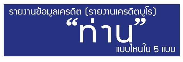 เวลาที่สถาบันการเงินจะพิจารณาให้สินเชื่อเรา เขาก็จะไปขอรายงานข้อมูลเครดิตมาจากเครดิตบูโร ซึ่งรูปร่างหน้าตา (สำหรับกรณีบุคคลธรรมดา) ก็จะเป็นประมาณนี้ ทีนี้เราลองมาดูกันเล่นๆ ค่ะว่า รายงานข้อมูลเครดิตที่พบบ่อยๆ มีอะไรบ้าง และข้อมูลเครดิตของเราจะเป็นแบบไหนใน 5 แบบนี้