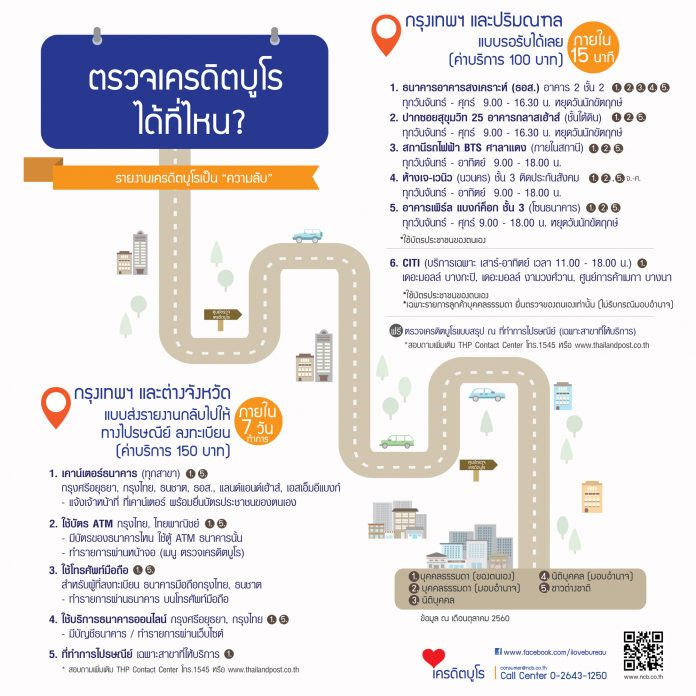 พวกเรา (ในฐานะบุคคลธรรมดาที่ไม่ใช่สถาบันการเงิน หรือธนาคารที่เป็นสมาชิกเครดิตบูโร) สามารถขอดูข้อมูลเครดิตบูโรเกี่ยวกับตัวเราเองได้ที่ธนาคารบางแห่ง หรือศูนย์ตรวจเครดิตบูโร ดังต่อไปนี้