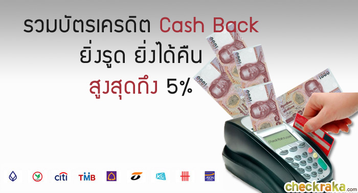 สำหรับบัตรเครดิต Cash Back นั้น จะโดดเด่นมากในเรื่องของการคืนเงิน โดยผู้ออกบัตรเครดิตมักจะตัดสิทธิ์ในส่วนของการสะสมคะแนนออกไป และแทนที่สิทธิประโยชน์นั้นในรูปแบบของการคืนเงินแทน เข้าใจง่ายๆ ก็คือ เมื่อคุณใช้จ่ายผ่านบัตรเครดิตไม่ว่าจะเป็นการช้อปปิ้ง หรือชำระค่าบริการต่างๆ ทุกยอดการใช้จ่ายที่เกิดขึ้นจะกลายเป็นเงินคืนกลับมาสู่บัญชีบัตรเครดิต หรือบัญชีเงินฝากของคุณ (แล้วแต่ข้อตกลงในการเลือกรับเงินคืนของผู้ถือบัตรฯ หรือข้อกำหนดในการเครดิตเงินคืนของแต่ละสถาบันการเงิน) และโดยทั่วไปแล้ว บัตรเครดิตของแต่ละเจ้านั้นจะแยกสิทธิประโยชน์ออกไปเลยว่า บัตรไหนให้ "เครดิตเงินคืน" หรือ "คะแนนสะสม" หรือบางเจ้าก็ใจป้ำให้ทั้งเงินคืนและคะแนนสะสมกันเลยทีเดียว เอาล่ะค่ะ เมื่อพอจะเข้าใจรูปแบบของสิทธิพิเศษของบัตร Cash Back กันคร่าวๆ แล้ว เรามาดูกันดีกว่าว่ามีบัตรเครดิตใบไหน จากเจ้าของบัตรฯ ไหน? ที่เข้าข่ายการมอบสิทธิประโยชน์คืนเงินจากทุกยอดการใช้จ่าย
