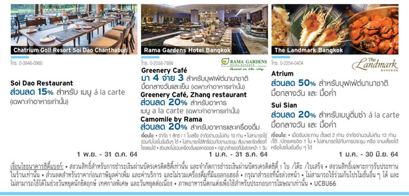 - เมื่อชำระด้วยบัตรเครดิตยูโอบีทุกประเภท รับส่วนลด 15% สำหรับบุฟเฟ่ต์มื้อกลางวัน (ทุกวันอาทิตย์) และเมนู A La Carte (เฉพาะค่าอาหารเท่านั้น)