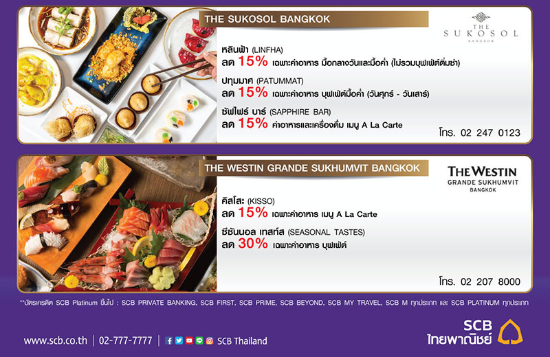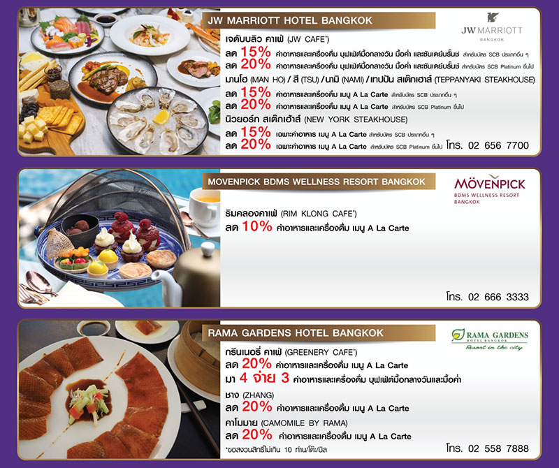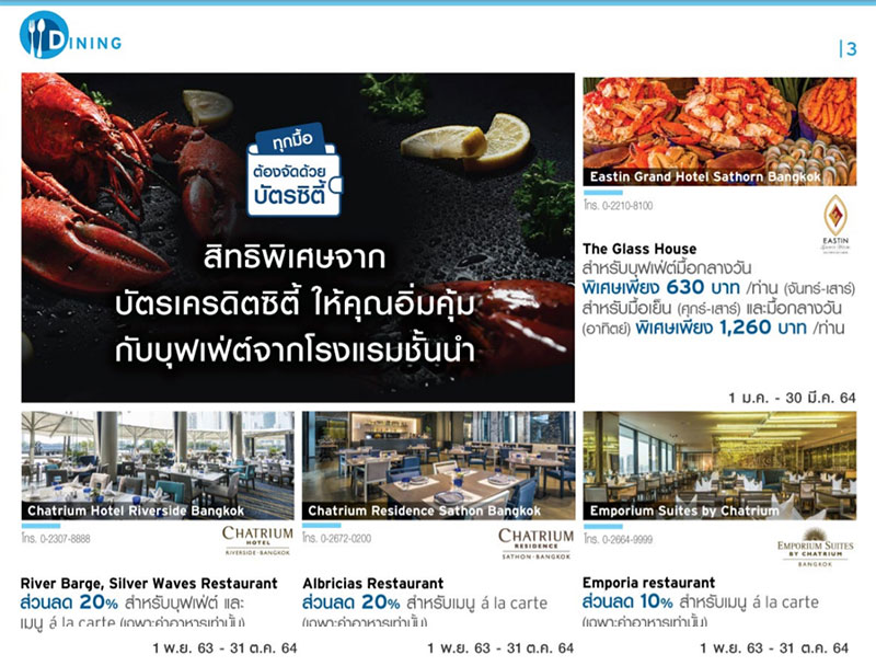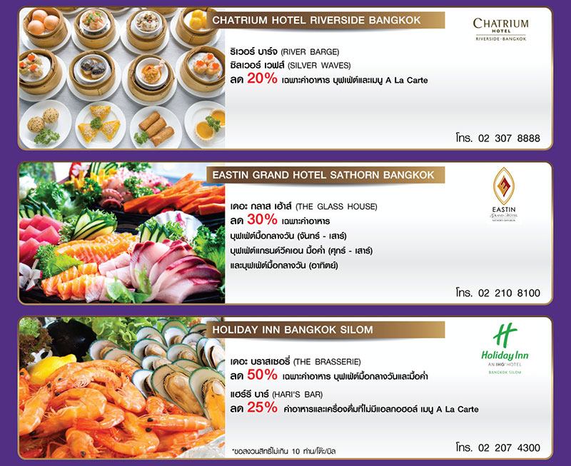 รับส่วนลดสำหรับค่าอาหารแบบ A la carte เครื่องดื่มที่มีแอลกอฮอล์และไม่มีแอลกอฮอล์ *รับส่วนลด 20% สำหรับบัตรอินฟินิท, บัตรผู้นำแพลทินัม ธนาคารกรุงเทพ